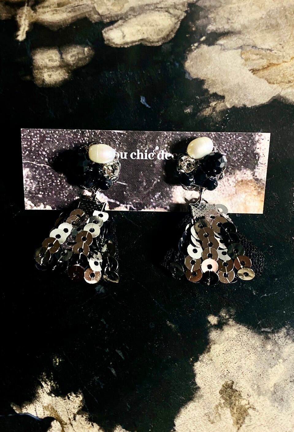 このアイテムは、ビジューを贅沢に使用した土台に、チュールとスパンコールであしらわれたリボンが揺れるデザインが特徴です。洗練された印象を与えるこのイヤーアクセサリーは、普段使いはもちろん、特別なシーンでも大活躍することでしょう。