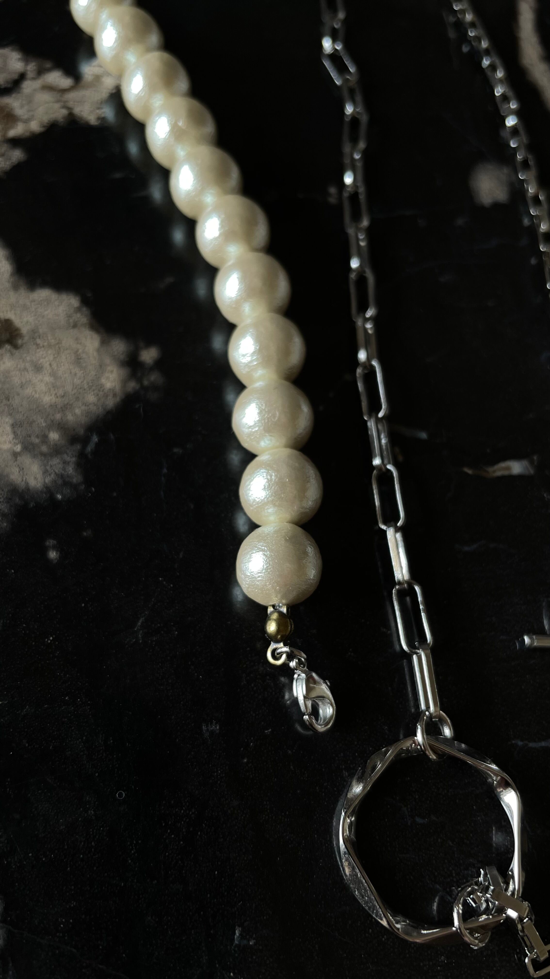 手作業で丁寧に仕上げられており、コットンパールの柔らかな光沢が魅力的です。パールを取り外すことで、シンプルなチェーンネックレスとしてのスタイルにも変化が楽しめます。この機能性のおかげで、おしゃれを楽しみながら、様々なシーンに合わせた使い方ができるアイテムです。